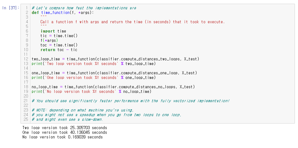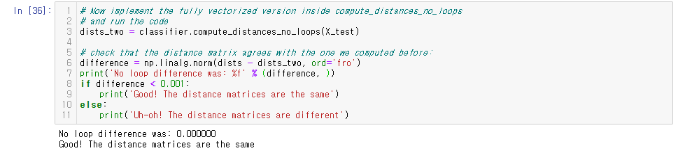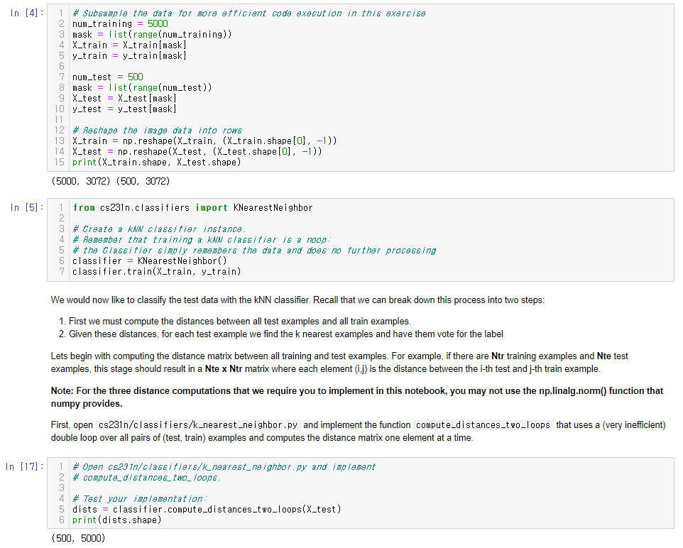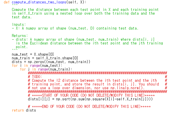 뭔가를 해야 하는 부분은 여기부터죠. 주석에 써 있는 경로에 가서 .py 파일을 idle로 연 뒤 주피터랑 같이 보면서 하면 편합니다. compute_distances_two_loops를 구현하라고 하죠. Two_loops 버전은 쉽습니다. 이중 for문을 돌려서 하면 되니까요. 이후에 one_loop랑 no_loops도 나오는데, 결국 dist(i,j) = L2_distance(x_test[i], x_train[i])인 행렬 dist를 구하는 메서드인건 같습니다. Loop 수를 줄여서 빠르게 만들라는거죠.