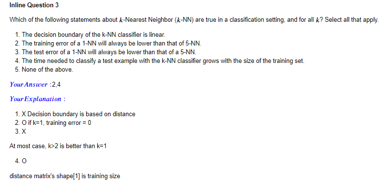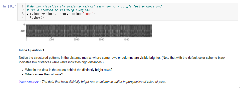Inline Q1입니다. 이런 중간중간에 퀴즈 있는게 참 재밌는 것 같아요. 저 그림에서 세로축이 test data고 가로축이 train data이고, 색이 밝을수록 L2 distance가 큽니다. 가로에 밝은 선이 의미하는건 어떤 test data가 모든 train data와 L2 거리가 멀다는 의미죠. 세로 선은 반대로 어떤 train data가 모든 test data와 거리가 멀다는 것이구요. 따라서 이 데이터들은 픽셀 값의 관점에서 봤을때 아웃라이어라고 생각했습니다. 다른 이미지들보다 밝기가 엄청 밝거나, 혹은 엄청 어둡거나 하는 식으로 값이 픽셀 값이 많이 차이가 날겁니다. 혹시 틀렸다면 댓글로 알려주시면 감사하겠습니다.