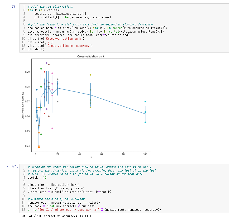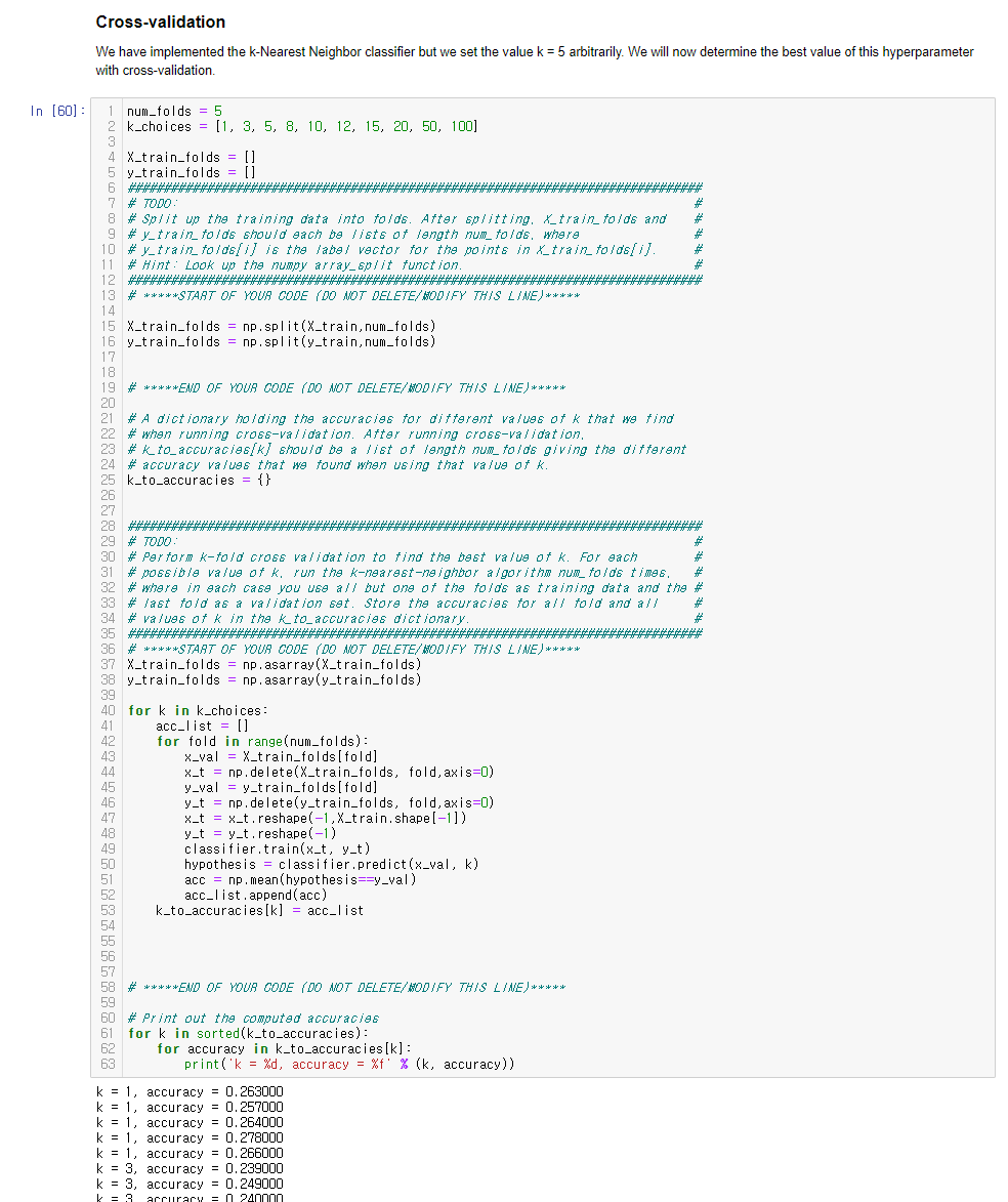 다음은 cross-validation입니다. Lecture2에서 배운대로 train data를 num_folds개로 쪼개서 각각의 fold를 한번씩 validation data로 써먹는 방법입니다. 소규모 데이터일때 그렇게 많이 한다고 합니다. 이 과정에서 우리의 hyperparameter들을 정해야 합니다.