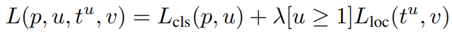 이건 Iverson bracket indicator function이라는 거고, 한국말로는 아이버슨 괄호라고 한다. [P]에서 조건 P가 참이면 1을, 아니면 0을 뱉는 함수이다. 여기서는 u가 해당 RoI의 class인데, u가 0인 경우는 background이므로 bounding box 자체가 성립이 안되기 때문에 이 함수를 사용한 것이다.