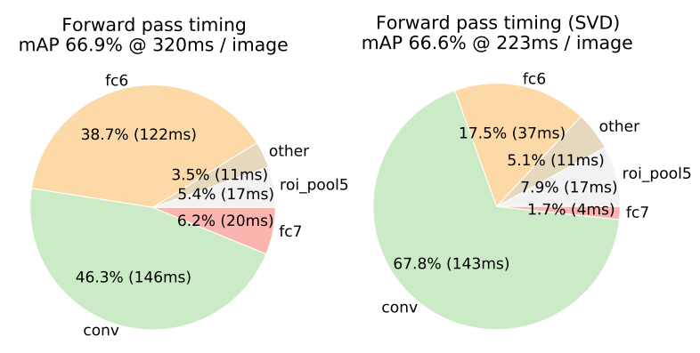 Forward pass에서 fc layer가 차지하는 시간이 대략 절반 정도인데, truncated SVD를 이용해서 fc의 parameter를 줄이면 시간상의 이득을 볼 수 있다.