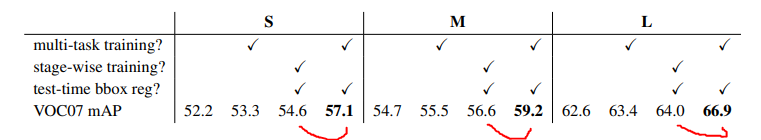 Stage-wise와 multi-task 방식 간에 mAP 차이가 꽤 난다. 단순히 훈련 과정을 간소화시킨 것 뿐 아니라 성능의 향상도 가져왔다.